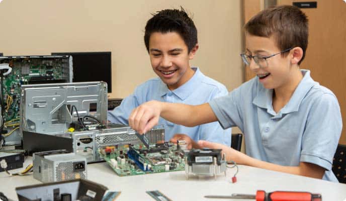 Specialty Classes Home / Academics / Specialty Classes Get More From Your Child’s Education Our diverse curriculum gives our students a well-rounded private school education, with classes that help them grow in all kinds of ways. Specialty classes let students explore their interests, try new skills, and discover what they enjoy! Classes include Spanish, music, art, physical education, and technology. Each program is planned to meet national standards and support all areas of our students’ growth. By taking part in these courses, our students become curious learners who are prepared for what comes next. Learn More About Our School Spanish Our students learn Spanish for speaking, listening, and writing. They connect what they learn with real-world experiences. They see how knowing another language can help them understand another culture and better communicate with people from around the world. Our goal is for our students to go beyond learning Spanish as just a subject and become comfortable using it in real life. They practice by speaking with friends, singing songs, and reading books. Music Our music class gives students exciting experiences where they explore the basics of music, try different instruments, use technology, and express themselves creatively. Teachers guide students step-by-step. They help them create, perform, enjoy music, and build their appreciation and skill. Our students learn about rhythm, melody, and how sounds blend to make music. Through group performances, they learn to work together and gain confidence on stage. Art Our students work with different materials to learn techniques and make art. Our teachers guide them in building skills like creative thinking and problem-solving. Our students start to see the connections between art, history, and other subjects. They explore color, shapes, and textures, and find new ways to express themselves. By making and talking about art, they grow to appreciate and understand the world around them. Our students feel excited to share their work with others. Physical Education Our students learn about the importance of staying active and making healthy choices for a happy and balanced life. They practice making good choices for self-expression and positive social interactions. Our students do activities like running, jumping, and team sports to build their strength and balance. By working with each other, they also learn teamwork and how to support their friends. These skills help our students feel confident and strong as they grow. Technology We use technology to find, sort, and share information. Our students learn skills such as coding, typing, and using tools like word processors, spreadsheets, and graphics. They also learn how to be responsible with technology, as they work with others and use their digital skills to explore new ideas. Our students see how these tools can help them solve everyday problems. As they explore, they gain the confidence needed to take on more advanced skills.